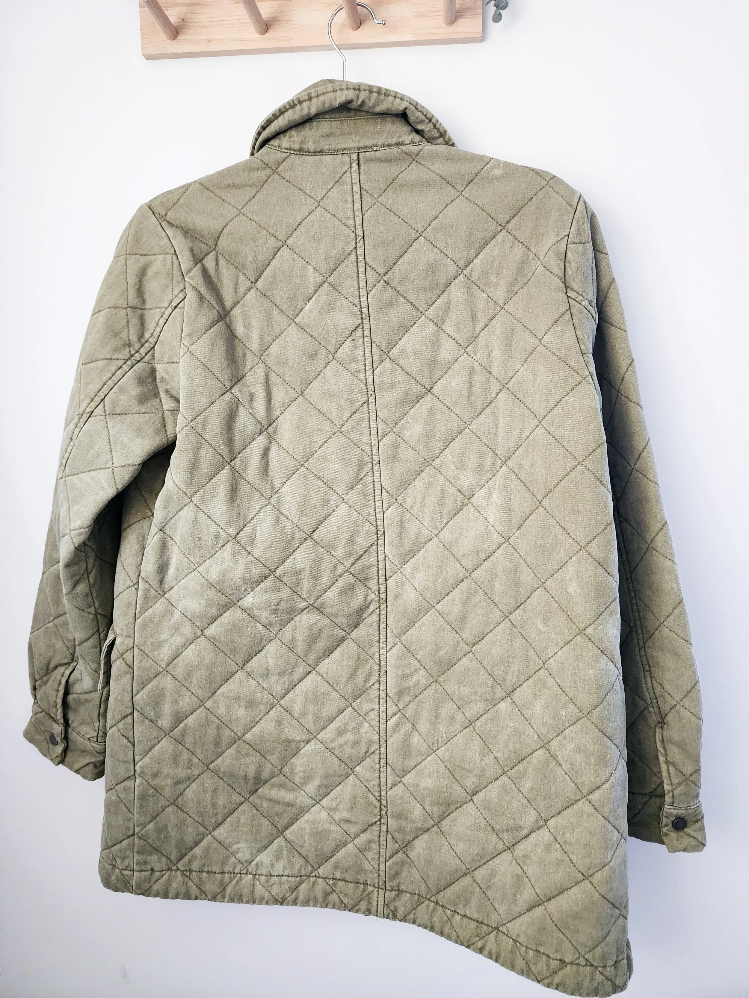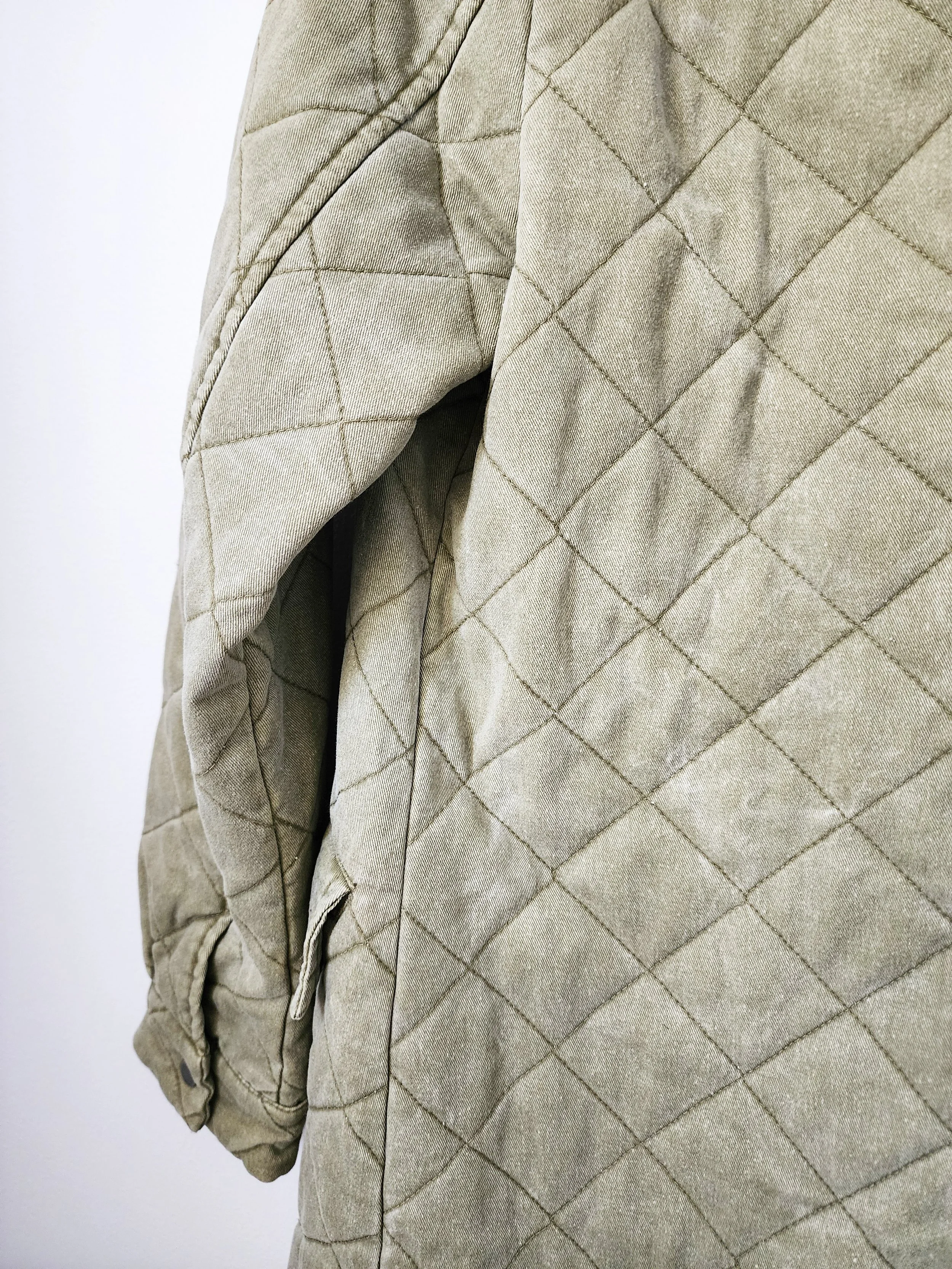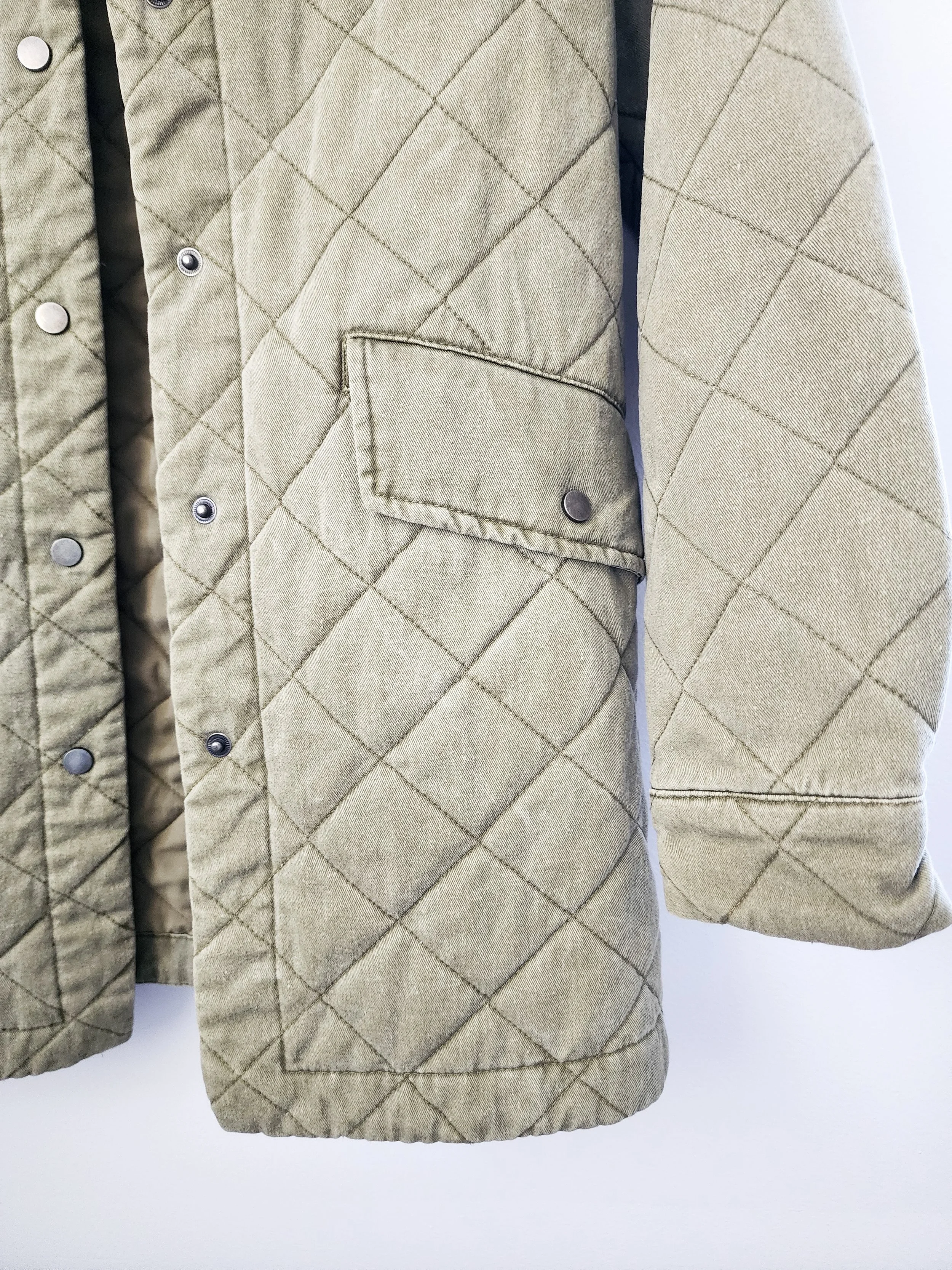 • features a quilted fit with a snap up front and cuffs along with deep pockets with snap-close flaps